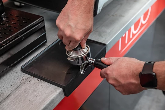 Use the tamper to ensure an even flow of water through the coffee and to maintain consistent pressure. The correct tamping pressure for a good espresso requires a weight of 12-15kg. Remove any excess coffee around the filter holder and lock it securely into the machine.