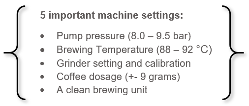 There are 5 important settings on a coffee machine that can make a dramatic difference to the coffee’s aroma, taste and the depth of flavour, these settings can account for up to 80% of the coffee’s overall taste profile!